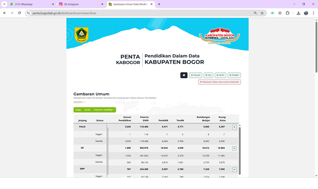 2. selaku pemangku kebijakan layanan pendidikan sesuai dengan Peraturan Bupati Nomor 129 Tahun 2021 Tentang Kedudukan, Susunan Organisasi, Tugas dan Fungsi Serta Tata Kerja Dinas Pendidikan. Dengan dasar tersebut Dinas Pendidikan Kabupaten Bogor meluncurkan program pengembangan sistem Pendidikan Dalam Data (PENTA) dengan harapan tercapainya pemetaan dan pemerataan penyebaran tenaga pendidik dan kependidikan di seluruh satuan pendidikan dengan tujuan pemaksimalan layanan pendidikan bagi masyarakat Kabupaten Bogor.